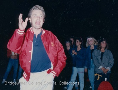 Bridgewater College, Photograph of Coach Daniel Antolik rallying students at a bonfire, 18 Sept 1987