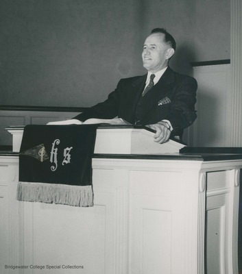 Bridgewater College, President Warren D. Bowman, smiling, pulpit