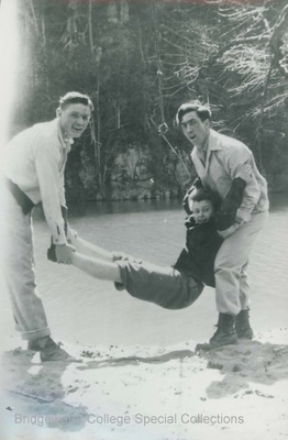 • Bridgewater College, Photograph of men pretending to throw a woman in water, 1946 by Bridgewater College
